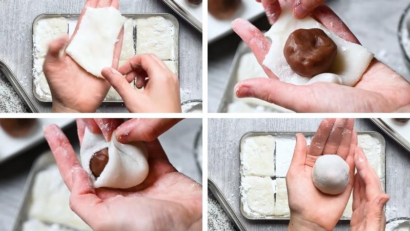 Rắc một ít bột năng khô ra mặt phẳng, lấy từng phần bột nhỏ, cán mỏng rồi cho nhân vào giữa. Gói kín lại, vo tròn nhẹ nhàng.
