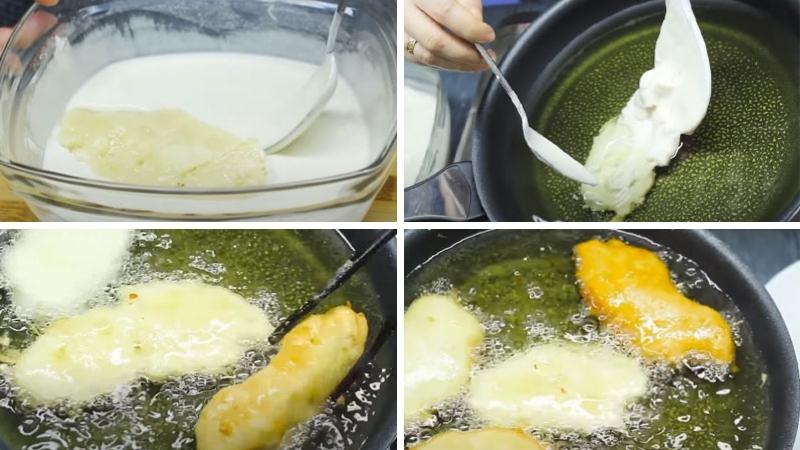 - Chiên chuối: Nhúng từng miếng chuối vào hỗn hợp bột, cho vào chảo dầu nóng và chiên đến khi vàng giòn hai mặt.