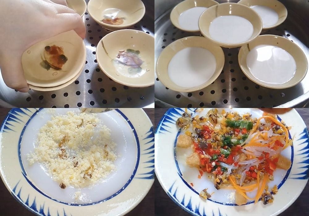 - Xếp chén vào xửng, thoa một lớp dầu mỏng để chống dính. Đợi chén thật nóng mới đổ bột vào (chỉ đổ khoảng 1/3 chén).