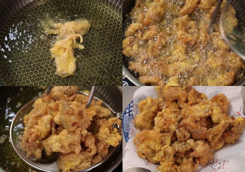 Bước 4: Chiên vàng Đun dầu nóng già, thả chân gà vào chiên ở lửa vừa. Khi lớp vỏ bột DAKI chuyển màu vàng óng và cứng lại, hãy vớt ra để ráo dầu.